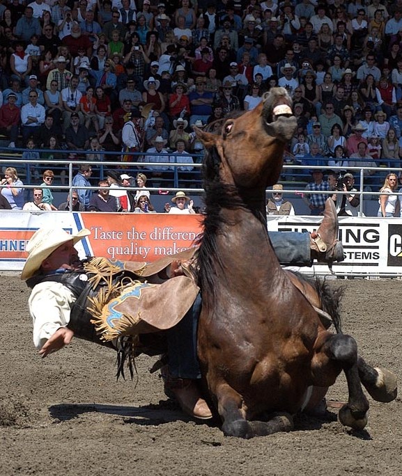 Many years ago I was so excited to be living in Calgary and attending my very first Stampede. When the chuckwagon racing started I just knew by the speed of the horses that there would be an accident and, of course, there was. Two horses went down and did not get up. A tractor came on the field and scooped them up in the bucket and off it went behind the fence. I felt immediately sick to my stomach and was so devastated by what I had witnessed that I left the stands and went home. The Calgary Stampede, Cloverdale Rodeo and everything else across Canada that is a huge money draw needs to be stopped. It is barbaric and an offense to the animals humanity.